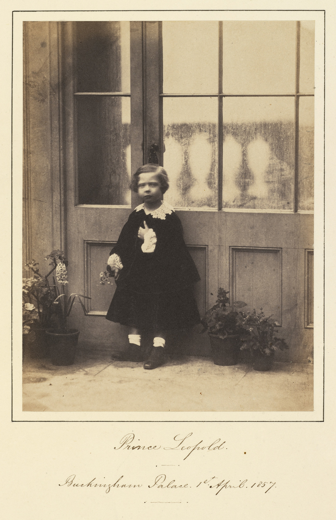 Photograph of a full length portrait of Prince Leopold, later Duke of Albany (1853-84) standing, facing towards the camera. He looks towards the camera and places his left hand on his chest. He holds some flowers in his right hand. Photograph taken outside Buckingham Palace.