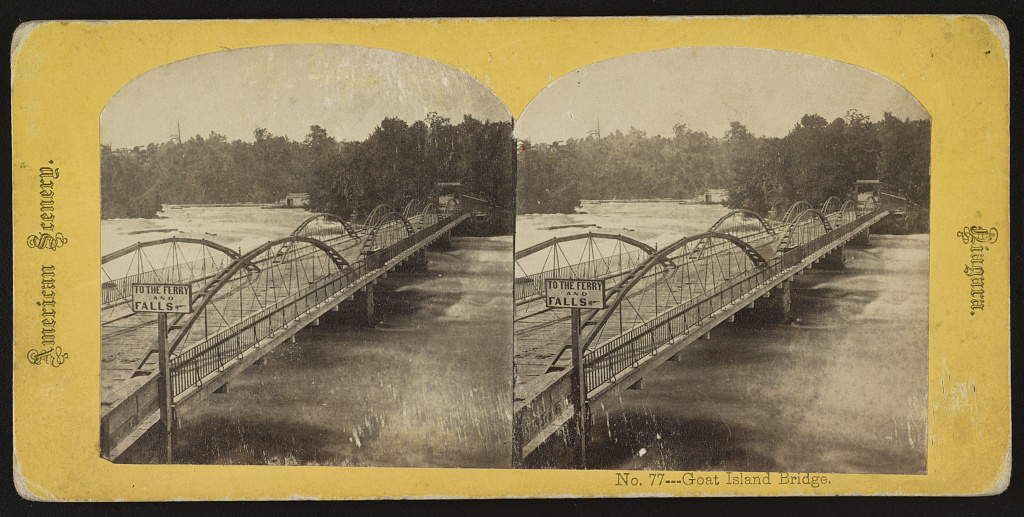 Photograph shows Goat Island Bridge, Niagara Falls, New York.