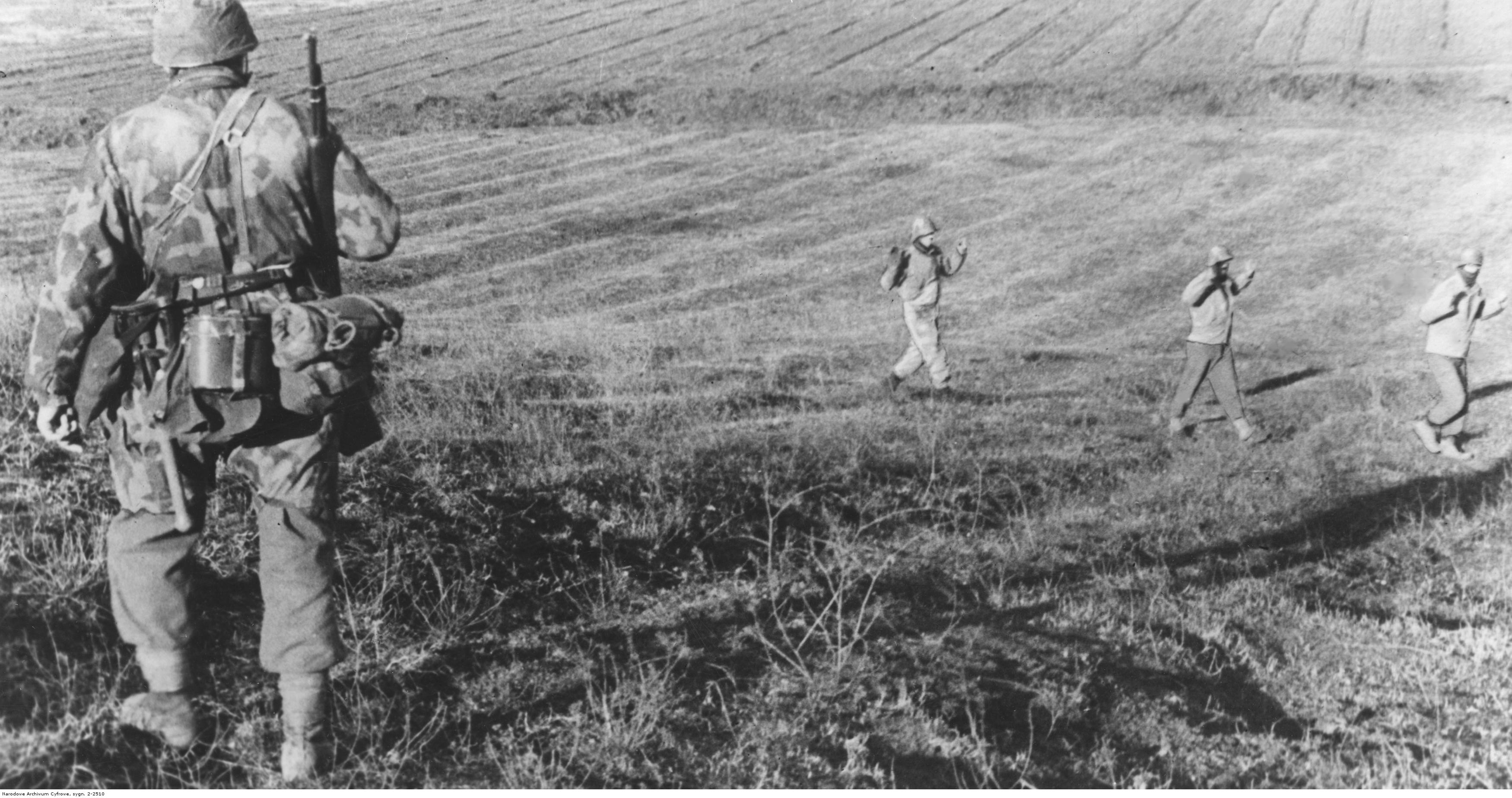 American prisoners of war with arms raised on the Nettuno bridgehead. In the foreground, an armed German soldier.