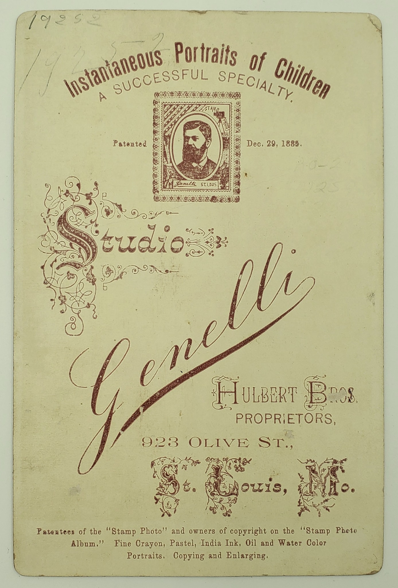 Backmark for "Studio Genelli, Hulbert Bros. Proprietors, 923 Olive St., St. Louis, Mo."
