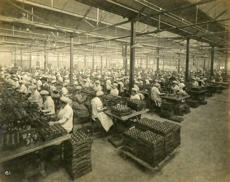 Private collection of John Quin This photo shows the soldering department where brass caps were soldered on to assembled fuses, at peak production 600 operators worked in the department completing 50,000 units per day.