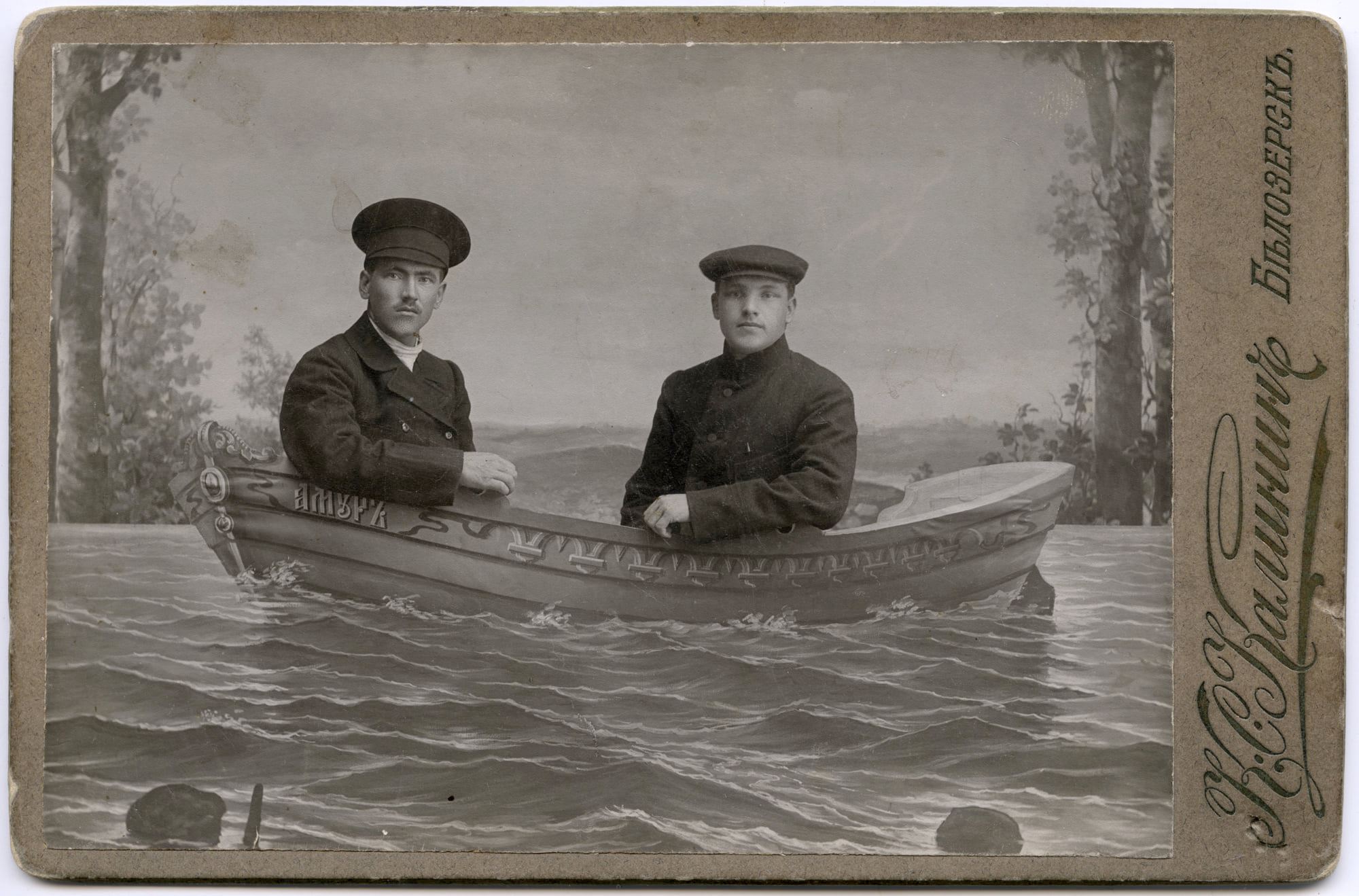 Studio portrait of two men with a boat foreground and background