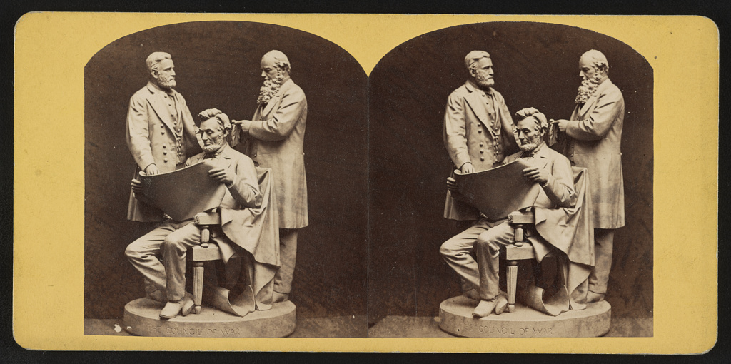 Photograph shows a Rogers Groups statuette depicing President Lincoln (seated) meeting with General Grant and Secretary Stanton during the American Civil War.
