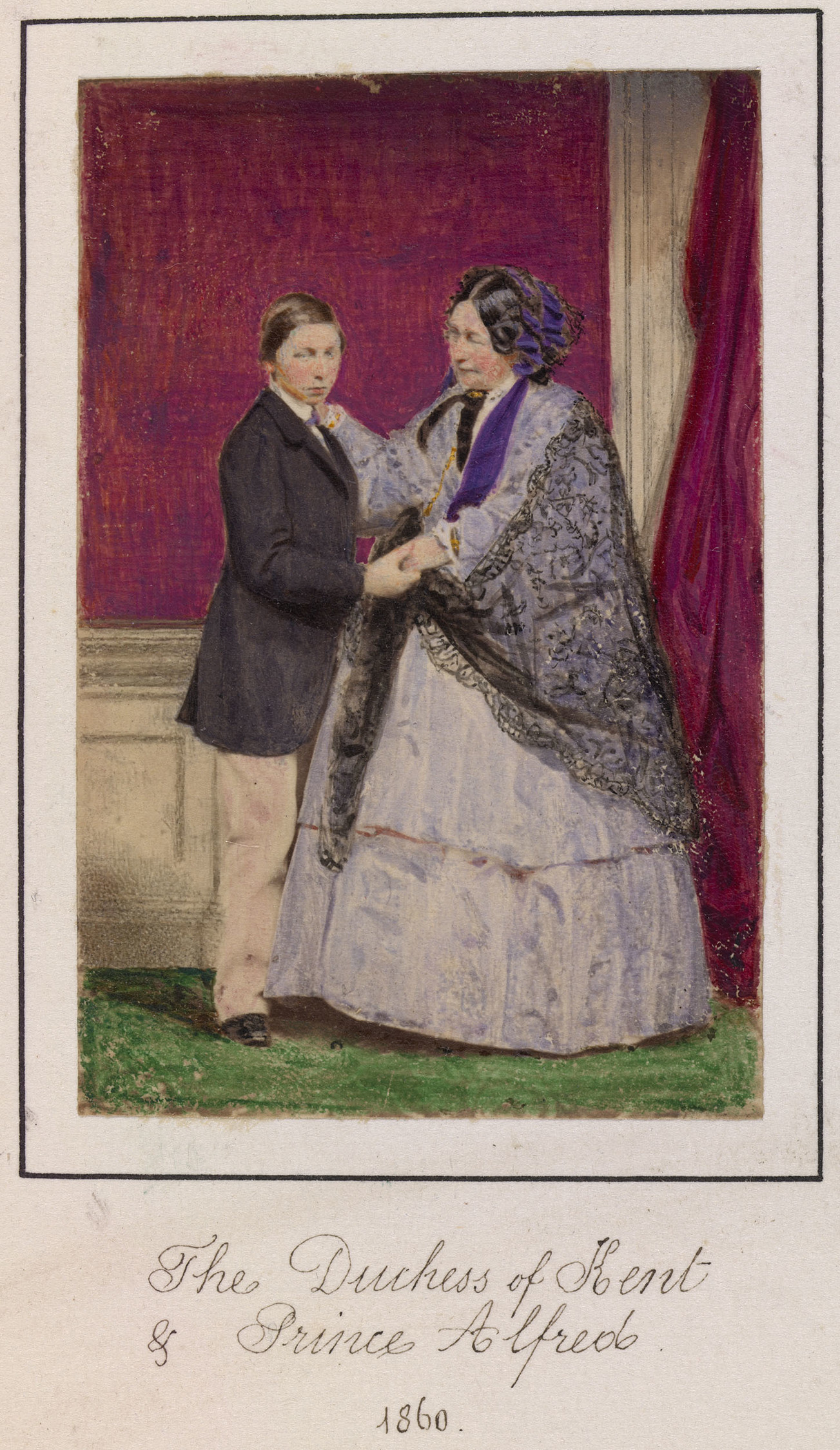 A Hand-coloured photograph of Victoria, Duchess of Kent (1786-1861) with her grandson Prince Alfred (1844-1900) holding hands. The back ground is painted red with red curtains, and the carpet is painted in green.