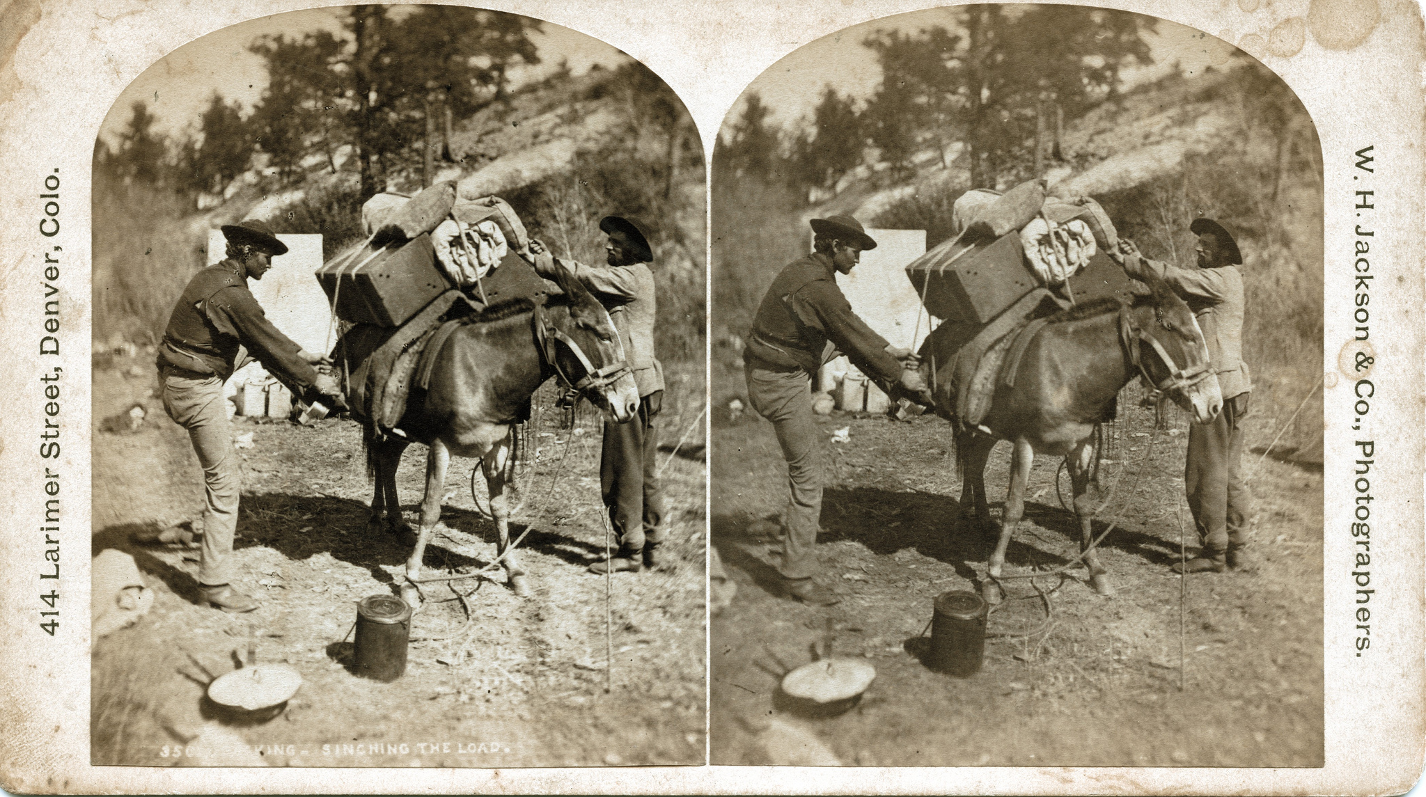 Notes: Jackson is on the right. Other version has on mount: Department of the Interior, U.S. Geological Survey of the Territories, Prof. F.V. Hayden in charge. Views among the Rocky Mountains of Colorado, W.H. Jackson, Photographer. In 1870 Jackson accompanied geologist Ferdinand Vandiveer Hayden on an expedition across Wyoming, along the Green River, and eventually into the Yellowstone Lake area. Jackson's images were the first published photographs of Yellowstone. Partly on the strength of these photographs, the area became America's first national park in March 1872.