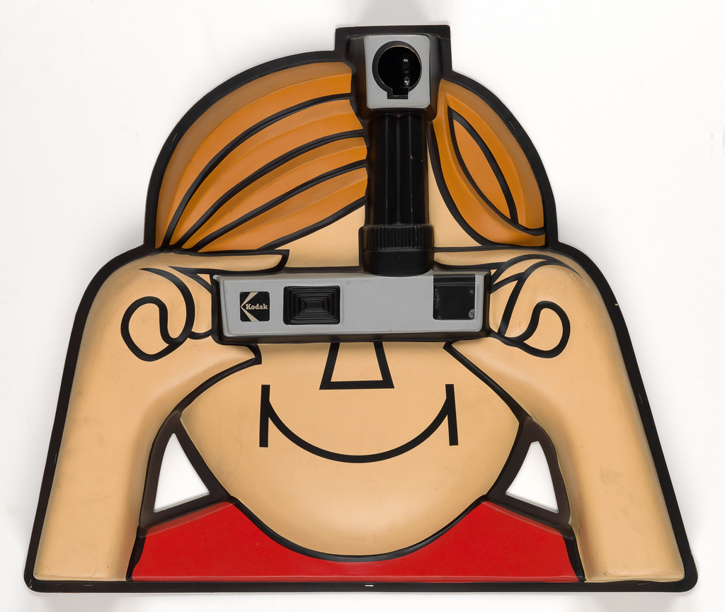 Wall-mountable and oversized 3-D advertising display of a cartoon character shooting with a Kodak camera (which has a flash mechanism)