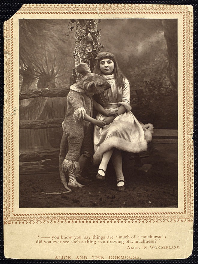 (Jack Wilgus, January 2026) This is a photograph that was inspired by Lewis Carroll’s Dormouse character in “A Mad Tea-Party”, Chapter VII from the 1865 novel “Alice’s Adventures in Wonderland.” This photograph is by Herbert Rose Barraud and was published by Carson and Comerford in 1887. Although it is not a Carroll photo it is still a fanciful and fun image. It is a Woodburytype showing Phoebe Carlo as Alice and Dorothy D'Alcourt as the Dormouse in a play based on Carroll’s stories at the Prince of Wales’s Theatre in 1887.