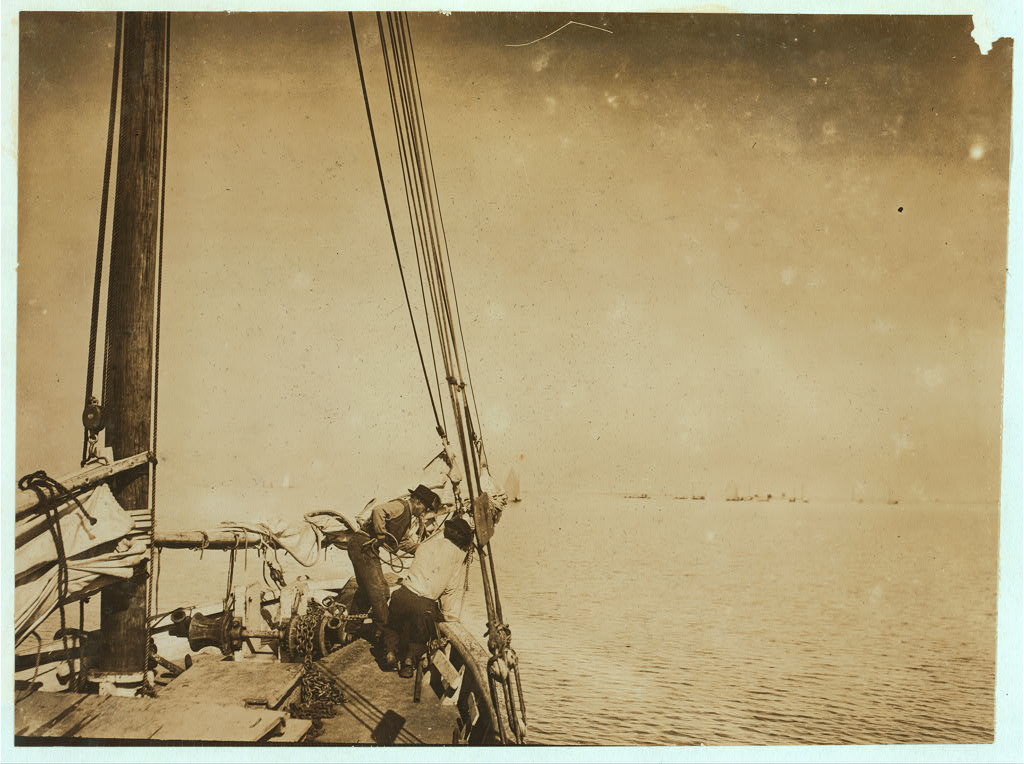 Oyster barge nearing the fleet fishing on the reefs. Location: Mobile Bay, Alabama.