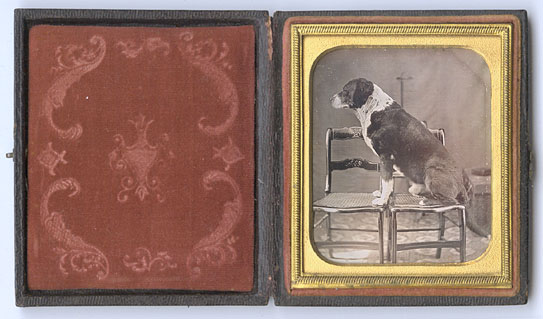 The massive canine of this image appears almost too much for the daguerreotypist's studio to handle. Posed in profile across two combined studio chairs, he remains at attention, in a rather precarious position, with amazing calm. To the left a bright shaft of sunlight falls onto the carpet, a photographer's posing stand is visible in the background at center, and to the right a dark object, perhaps a case, rests atop one of the photographer's trunks.