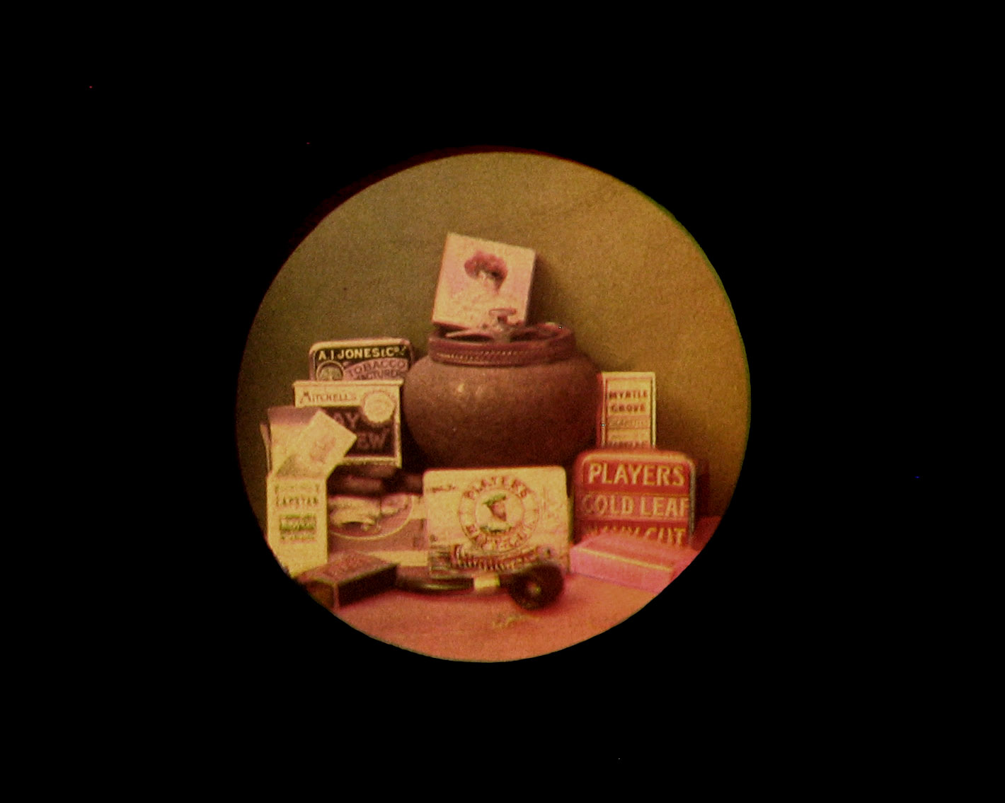 Ives made his exposures using a camera of his own design. This made three separate exposures on the same plate through orange red, violet blue and green filters. The negatives were developed and then contact printed onto a second plate to produce a silver bromide positive image. These three positives were cut apart and carefully mounted in a wood frame for inserting into a special three lens projector fitted with the three color filters. The Ives projector was a didactic tool; adjustable to allow separation or coincidence the images by the movement of a lever.