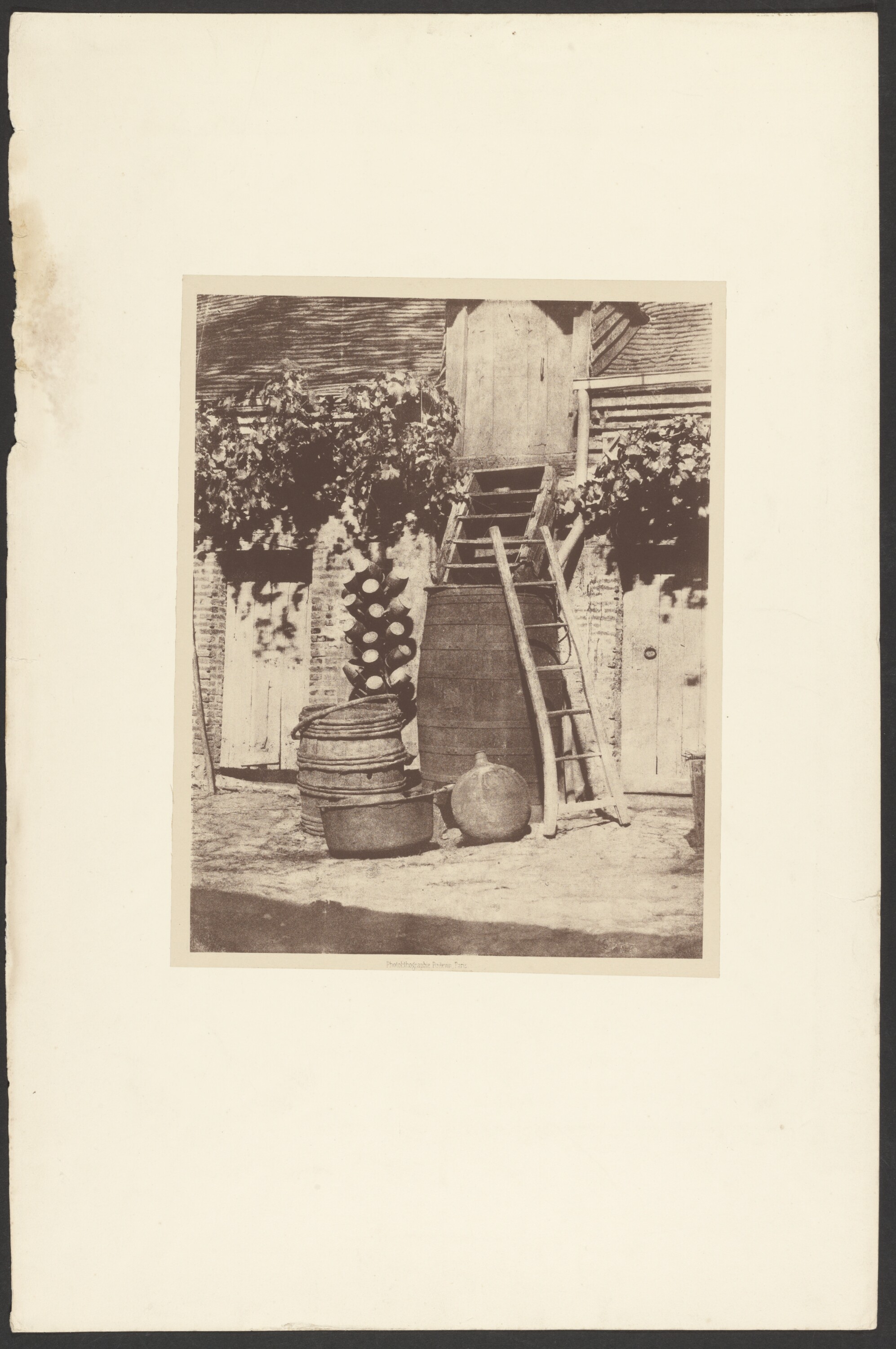 One large barrel beside a smaller barrel and a jug. A ladder is leaning against the larger barrel, with a second smaller ladder resting on the top of the barrel leading to a small wooden gate.