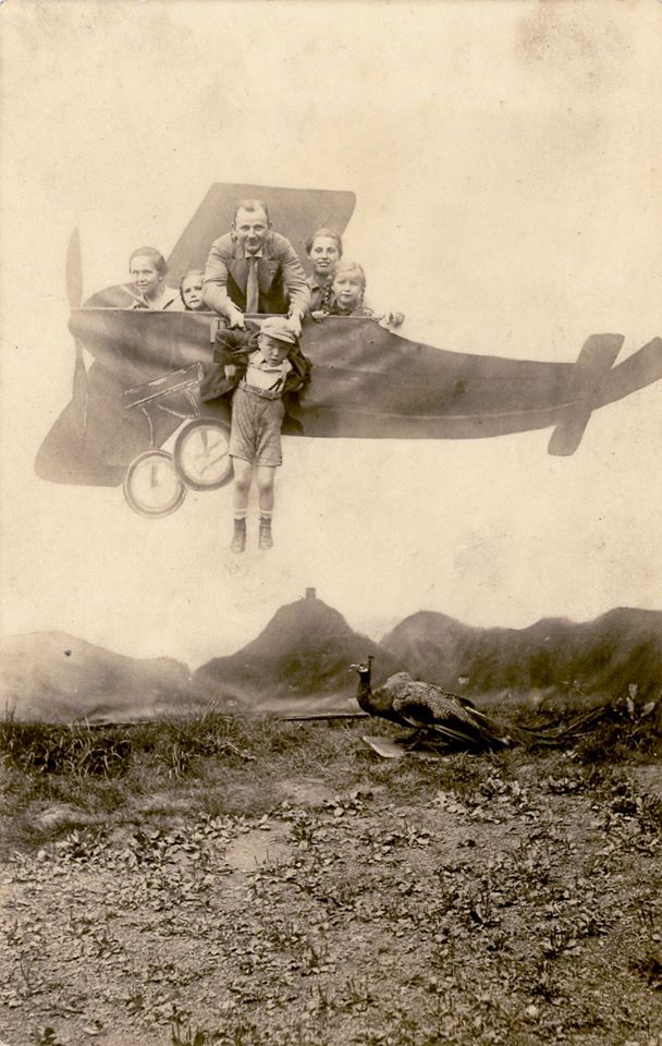A family with an aeroplane foreground and a stuffed bird of prey
