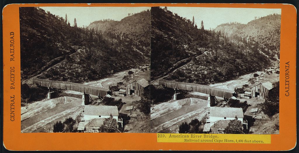 Alfred Hart 1865-1869 American River Bridge. Railroad around Cape Horn, 1,400 feet above [Central Pacific Railroad, California. Scenes in the Sierra Nevada Mountains. No. 229]