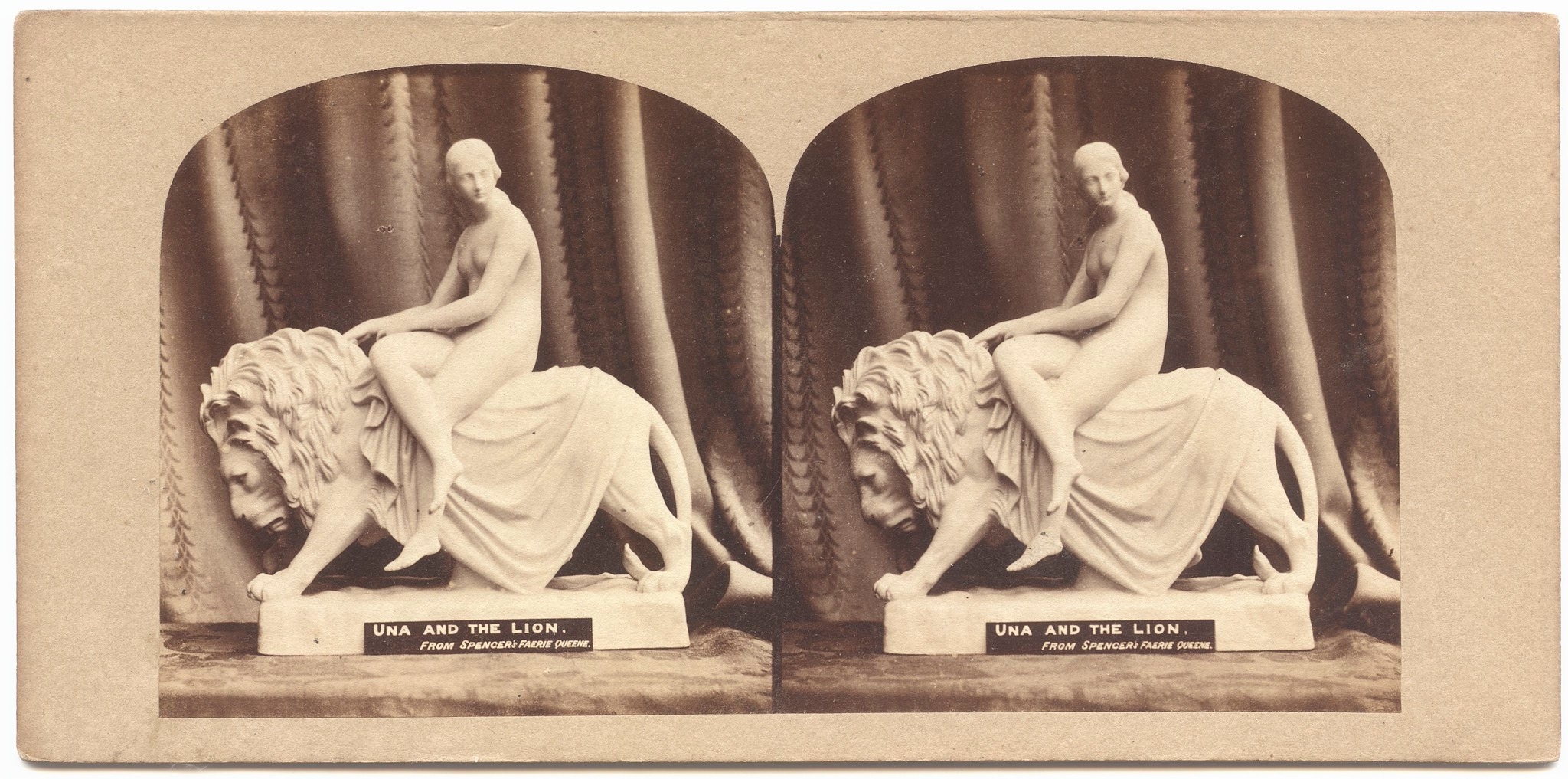 (Patrick Mongomery, 7 December 2025) The composition of Una and the the Lion was conceived and executed by the sculptor John Bell (1881-1895) but the subject is taken from Edmund Spenser's poem Faerie Queene (1590). Una had earlier been associated with Queen Victoria, when William Wyon designed the £5 coin that depicted 'her majesty as Una, holding the scepter, with her guardian the lion, emblem of England'. This full-size marble of Una and the Lion (now lost), was shown at the Great Exhibition and then put on long-term display at the Crystal Palace in Sydenham.