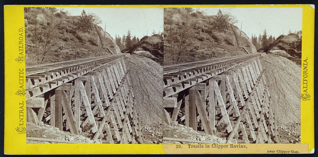 Alfred Hart 1865-1869 Trestle in Clipper Ravine, near Clipper Gap [Central Pacific Railroad, California. Scenes in the Sierra Nevada Mountains. No. 029]