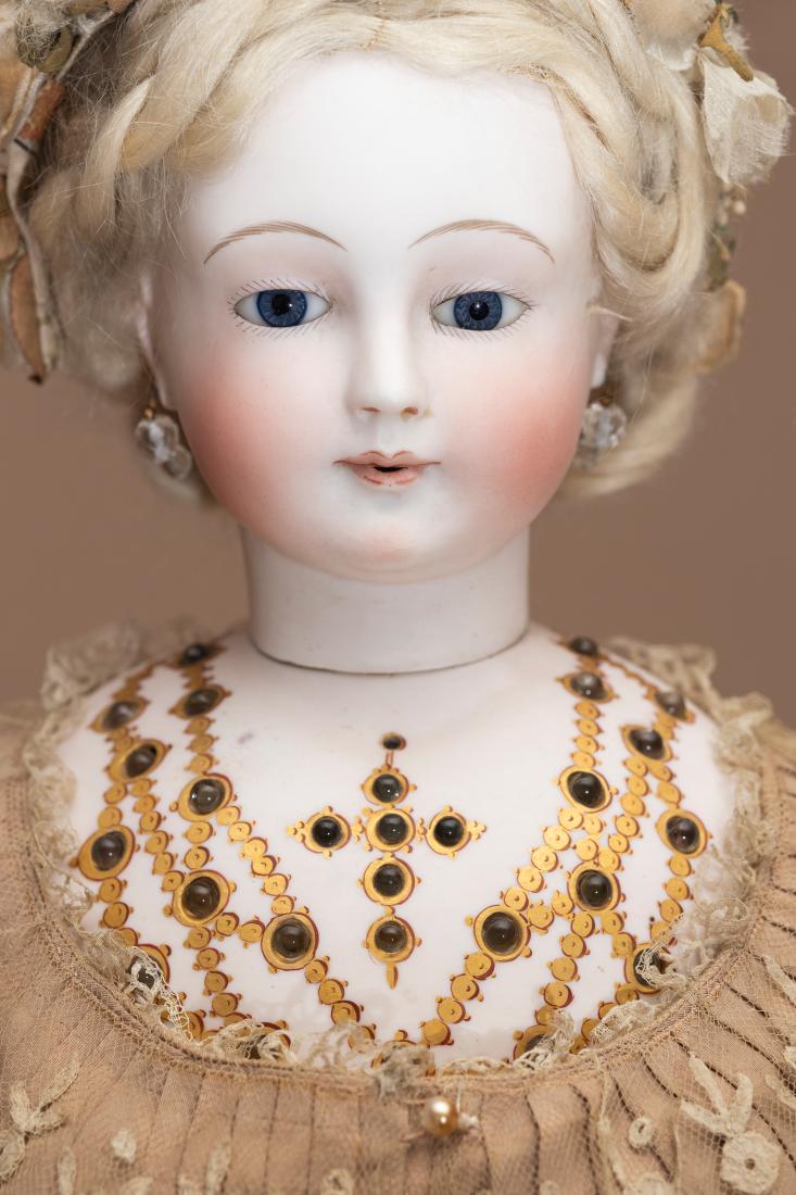 Doll, bisque porcelain, glass, human hair (head), kid leather (body), silk, cotton, paint, metal-mounted microphotographs