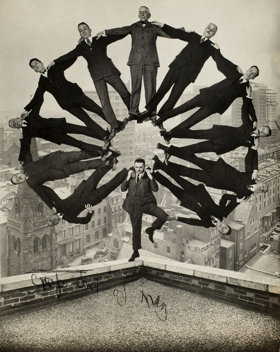 Man on Rooftop with Eleven Men in Formation on His Shoulders