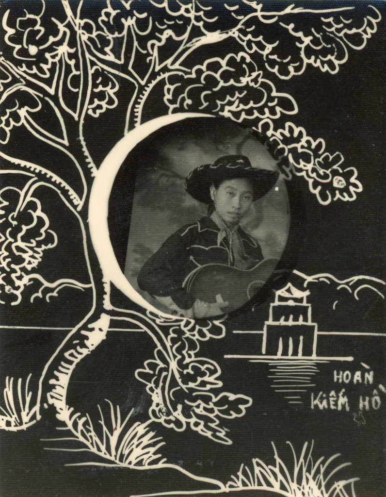 Studio portrait of young man playing guitar, printed in a "mask" of a tree and crescent moon