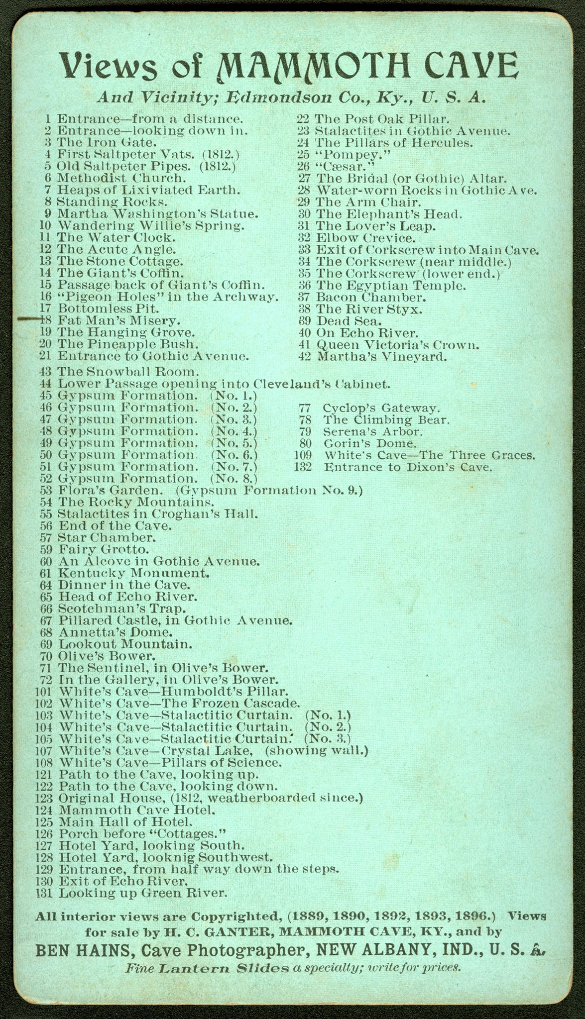 Backlist for "Views of Mammoth Cave and Vicinity: Edmondson Co., Ky., U.S.A. - Ben Hains, Cave Photographer, New Albany, Ind., U.S.A."