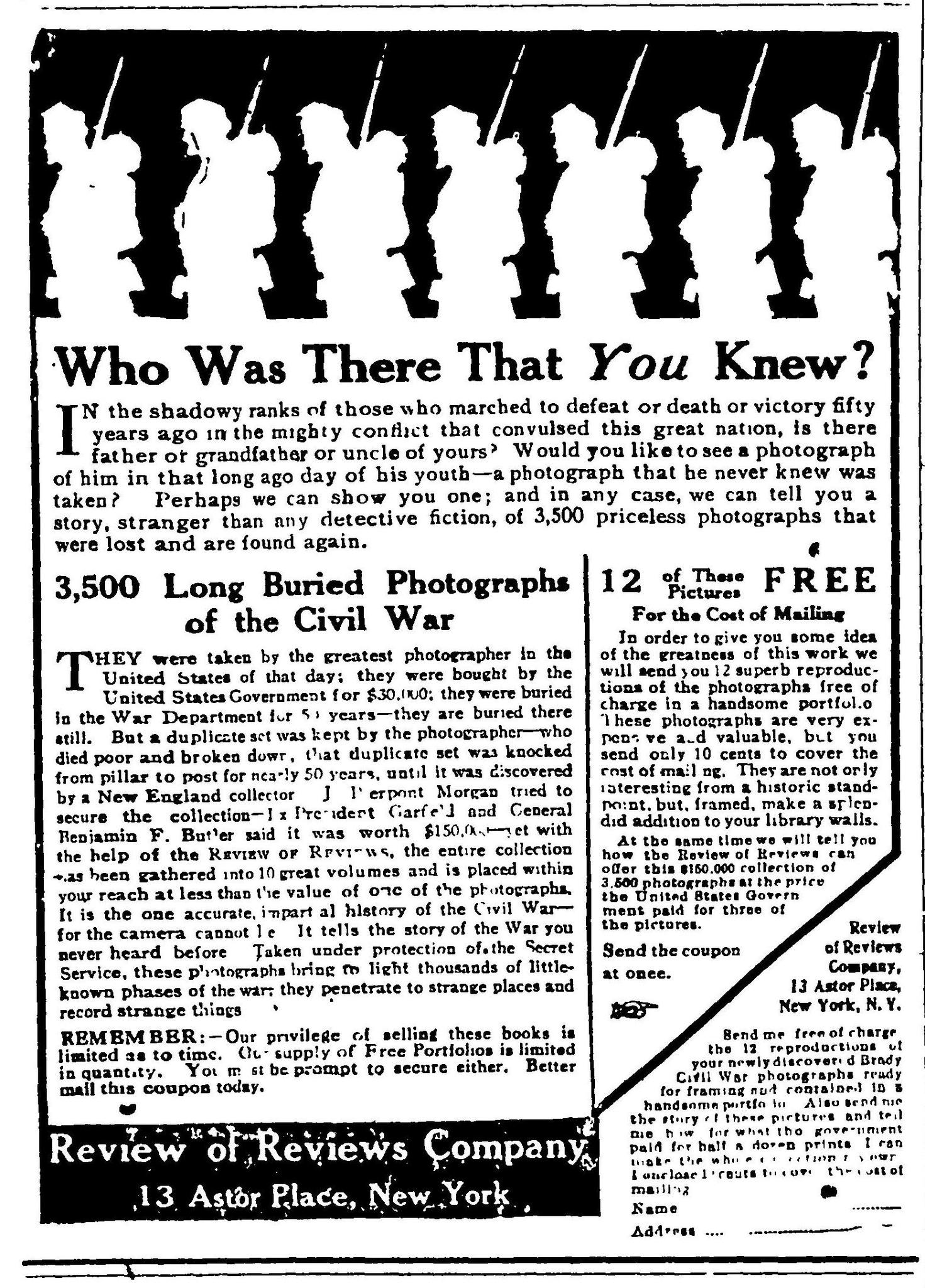 Review of Reviews ….has gathered into 10 great volumes…” and offer, "in order to you some idea….we will send you 12 superb reproductions" [of the newly discovered duplicate set of Brady] photographs…"