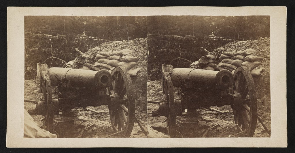 Photograph shows a damaged Confederate gun inside Port Hudson after the surrender in July 1863.