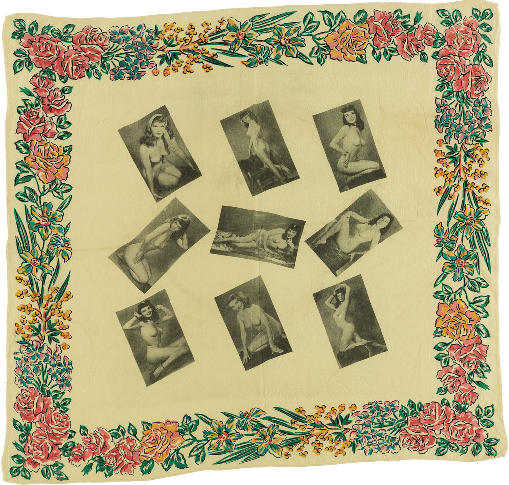 A montage of erotic images of nude women posing provocatively printed on yellow fabric with a floral border