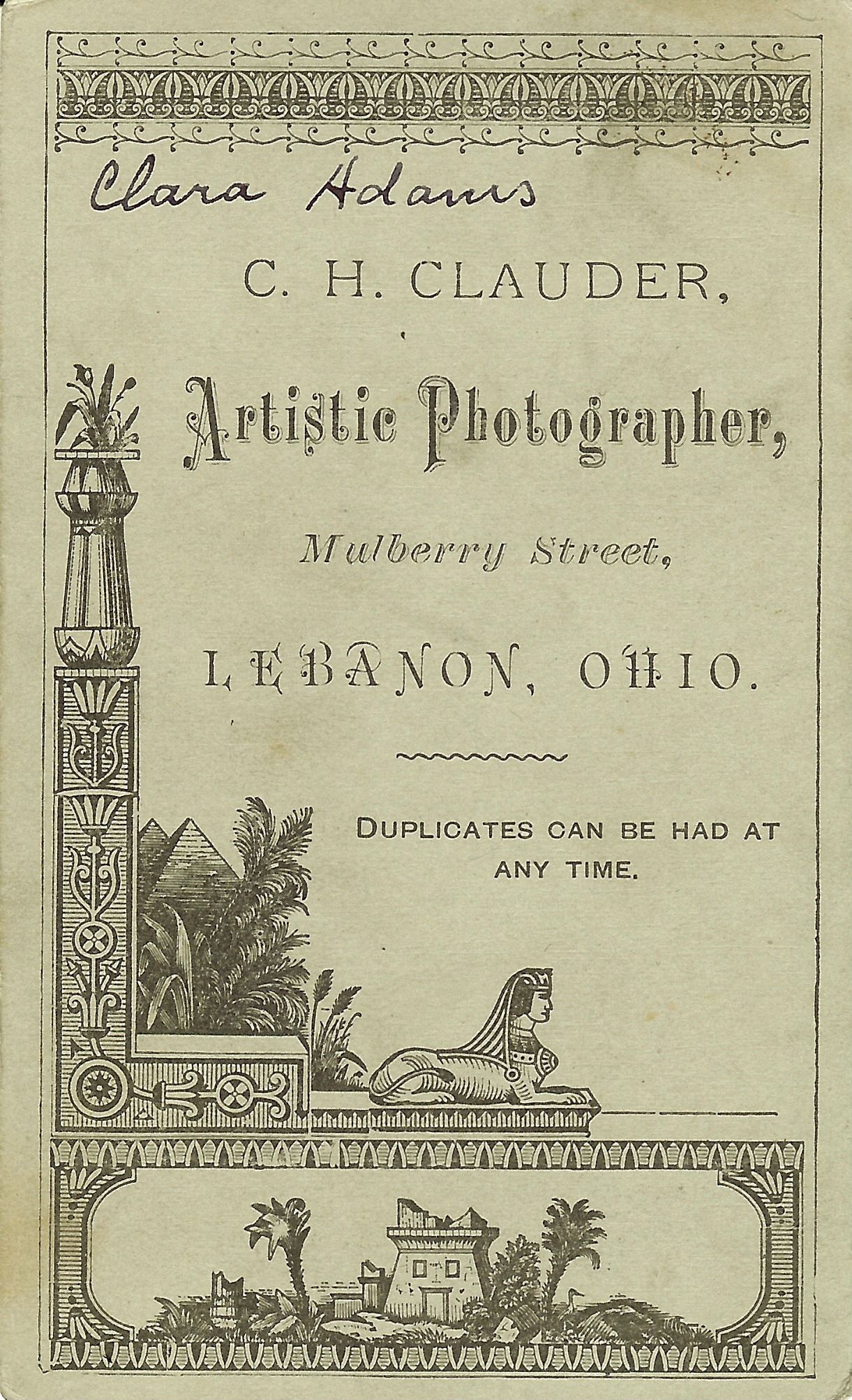 C.H. Clauder (Lebanon, Ohio) n.d. Backmark for "C.H. Clauder, Artistic Photographer, Mulberry Street, Lebanon, Ohio." with an Egyptian theme