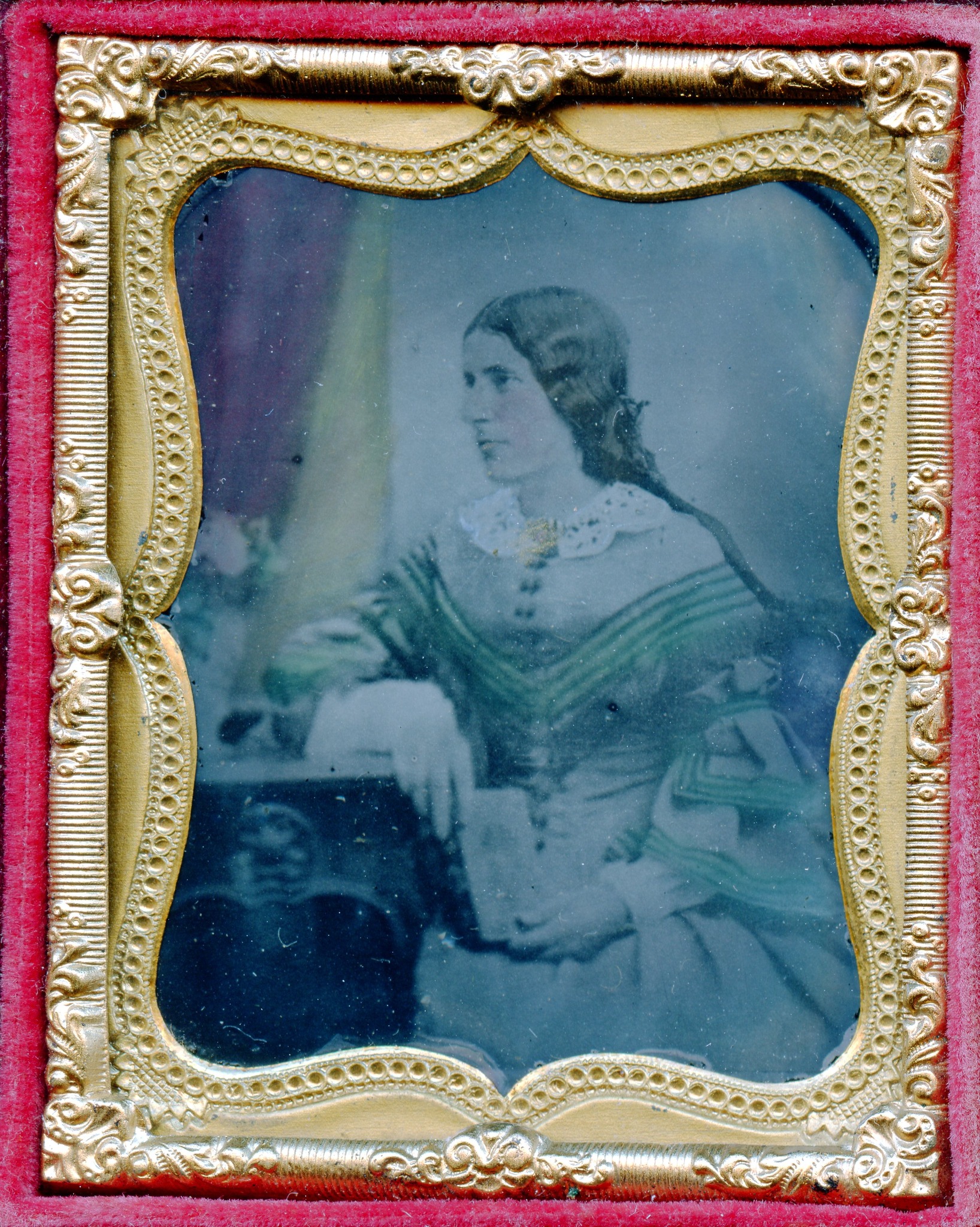 Ambrotype copy of a daguerreotype of a studio portrait of a seated woman holding a book