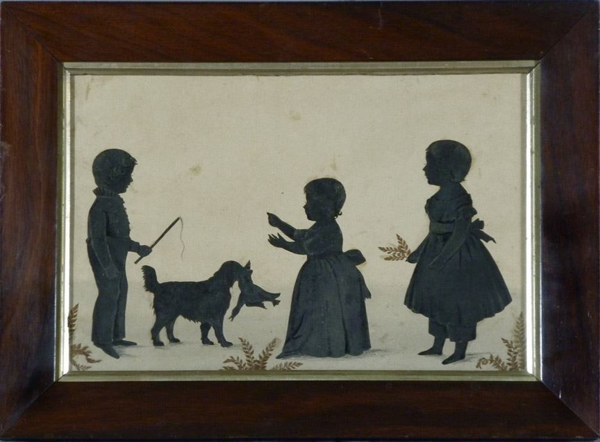 Silhouette of three children and their dog who holds a bird