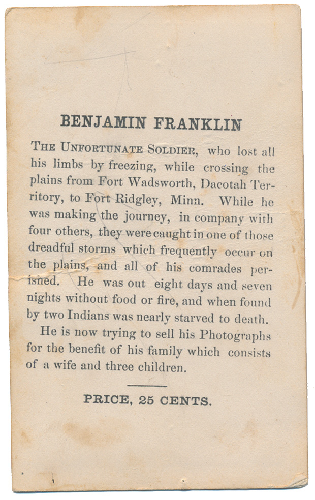 On back: Benjamin Franklin, The Unfortunate Soldier, who lost all his limbs by freezing, while crossing the plains from Fort Wadsworth, Dacotah Territory, to Fort Ridgely, Minn. While he was making the journey, in company with four others, they were caught in one of those dreadful storms which frequently occur on the plains, and all of his comrades perished. He was out eight days and seven nights without food or fire, and when found by two Indians was nearly starved to death. He is now trying to sell his Photographs for the benefit of his family which consists of a wife and three children. Price 25 Cents.