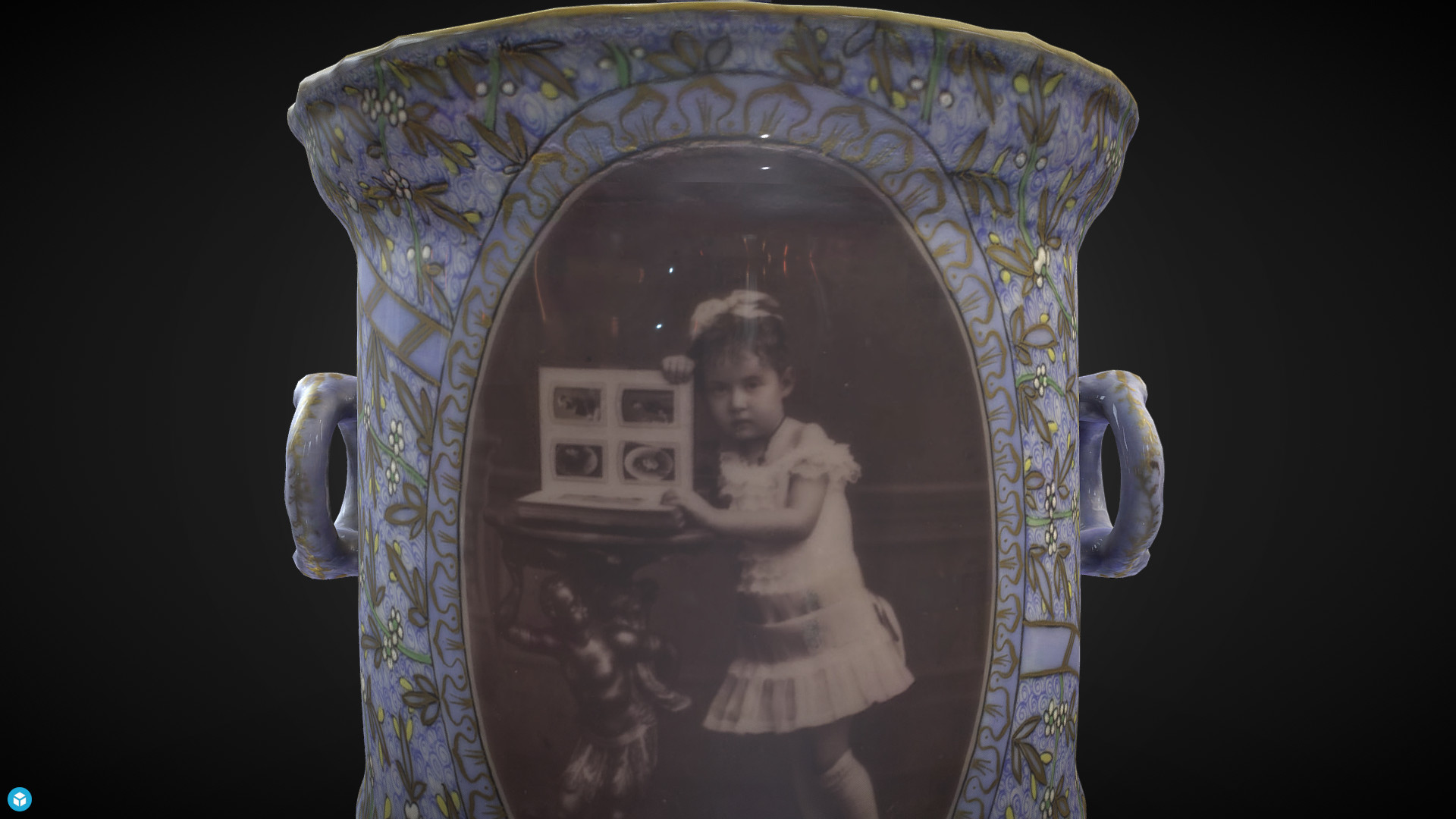 Photoceramic: lidded tobacco jar. with portraits of a little girl; one picture shows a photo album on a stand