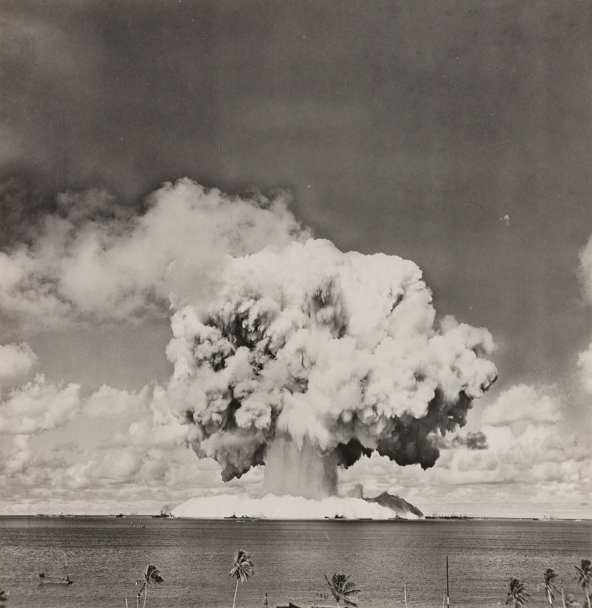 In January 1946, a U.S. nuclear weapon mission dubbed Operation Crossroads began testing atomic bombs on the remote lagoon of Bikini Atoll. Automatic cameras were mounted in towers on the lagoon and Crossroad pilots flew photo specific planes at a safe distance to capture the detonation stages of two atomic explosions, the Baker Day and Able Day blasts. The photographs in this collection showcase aerial views and stationary ground level shots of both blasts at various stages. Silver prints, the images measuring approximately 7x9 inches (17.8x22.9 cm.), the sheets 8x10 inches (20.3x25.4 cm.), and the reverse, most with a numeric hand stamp, on verso, and most accompanied by a typewritten caption. 1946