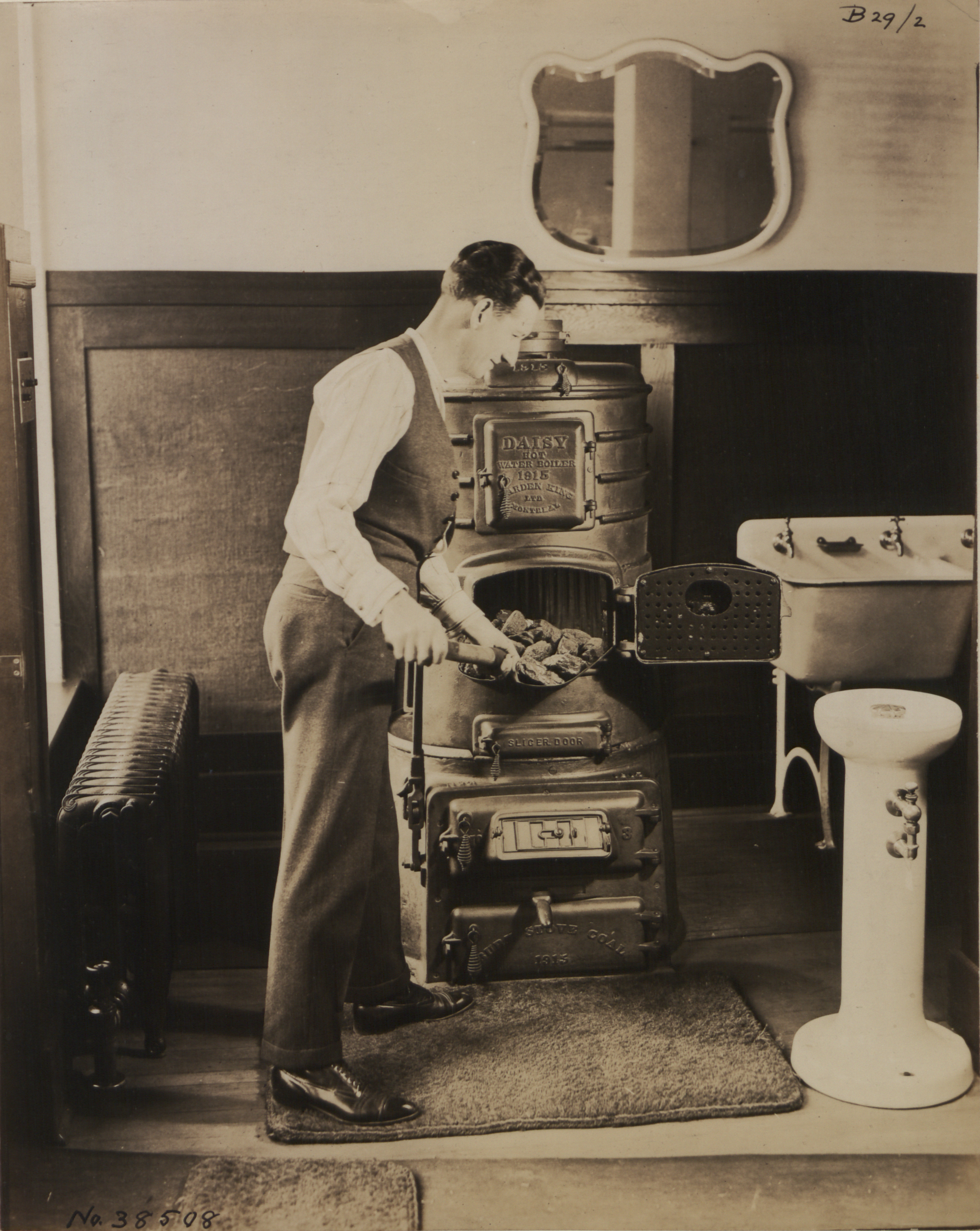 Living model in plumbing fixtures. Photo B. [Coal burning stove]