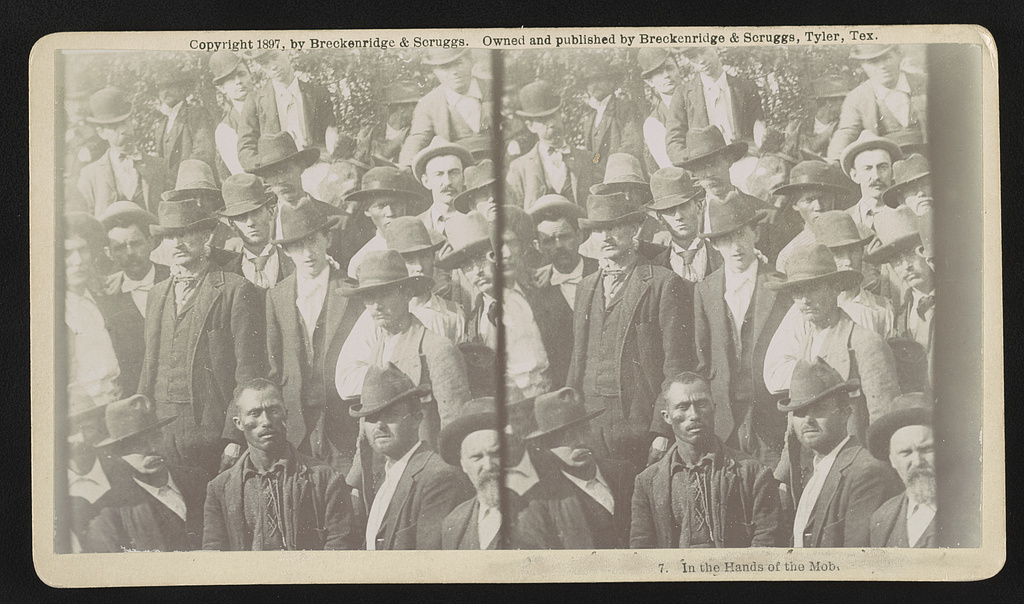 Stereograph shows an African American man, Robert Henson Hilliard, surrounded by a mob before being burned in Tyler, Texas; he was accused of raping and murdering a white woman.
