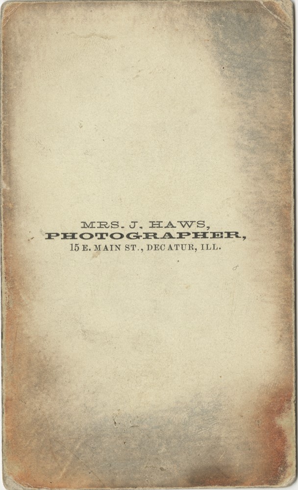 Backmark for "Mrs. J. Haws, Photographer, 15 E. Main St., Decatur, Ill."