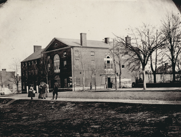 No. 213 of "Incidents of War" copyright 1862 by Brady. The letterpress title on the mount is "OLD CAPITOL," [leaving out "prison."] A later photograph of the building from the same angle by Pywell, Plate 90 in Gardner's "Sketchbook," shows interesting changes. What is most charming here is the bit of street life shown in the figures.