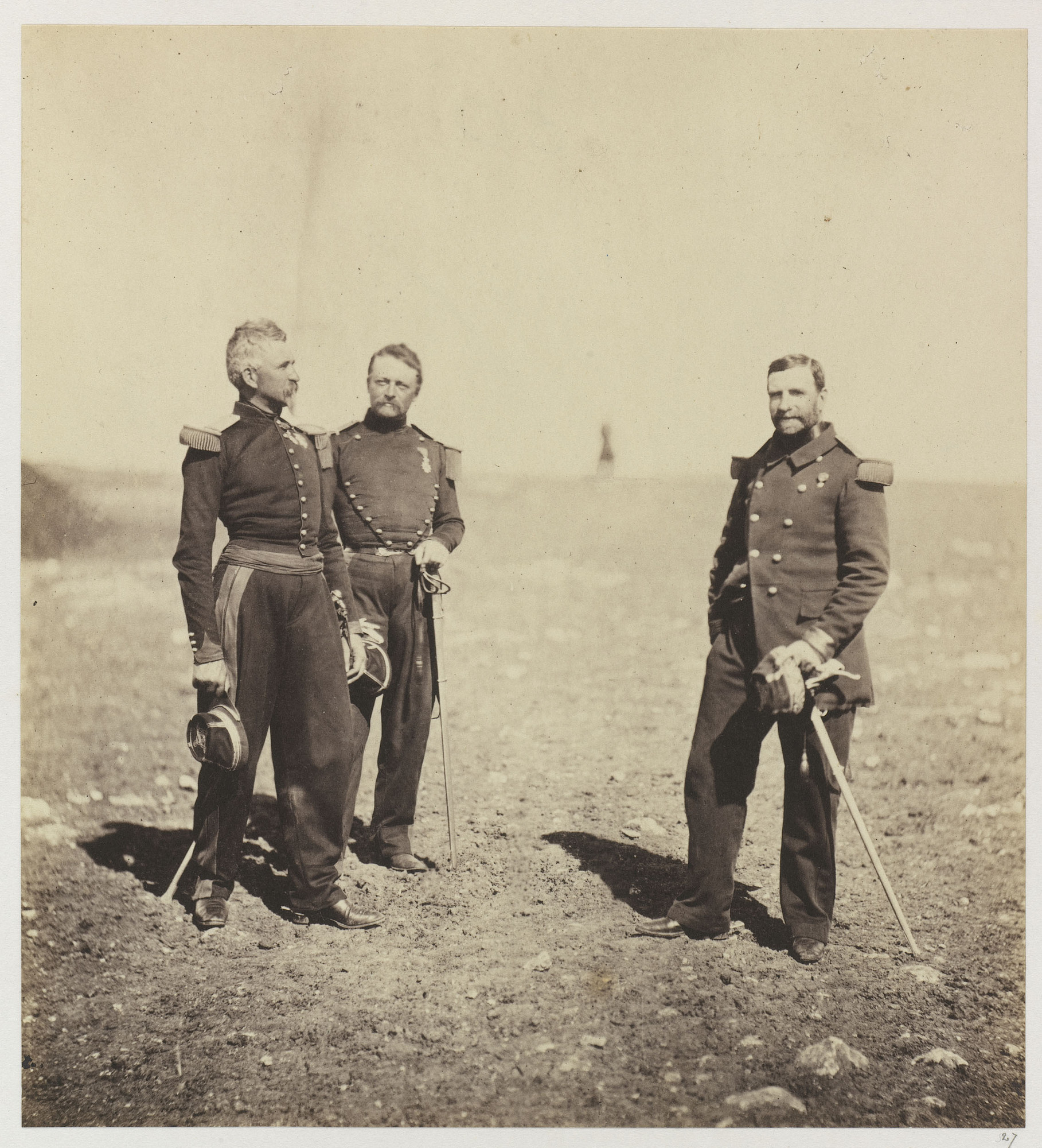 Photograph of General Labousiniére and General Beuret standing in an area of open land with another soldier. Two of the men stand together to the left and the other slightly apart to the right. All are wearing military uniform and carry a hat and sword.