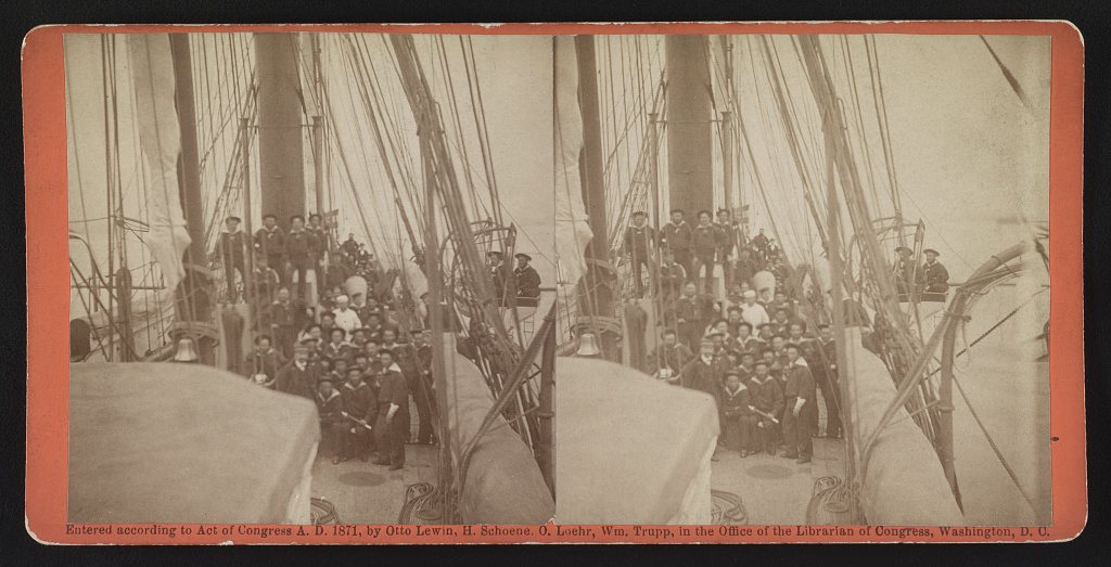 Stereograph shows crew of SMS Meteor on the ship's deck during visit to New York City after the Battle of Havana during the Franco-Prussian War.