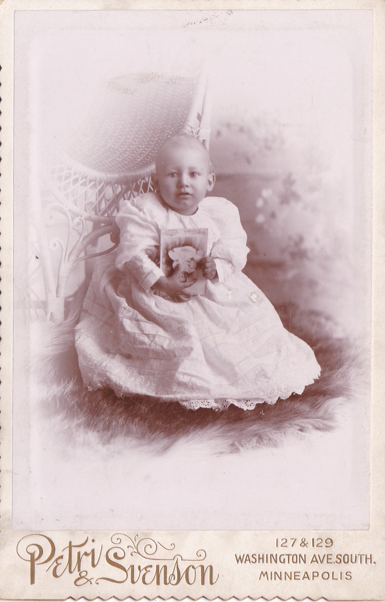 A young child holding a upside-down cabinet card