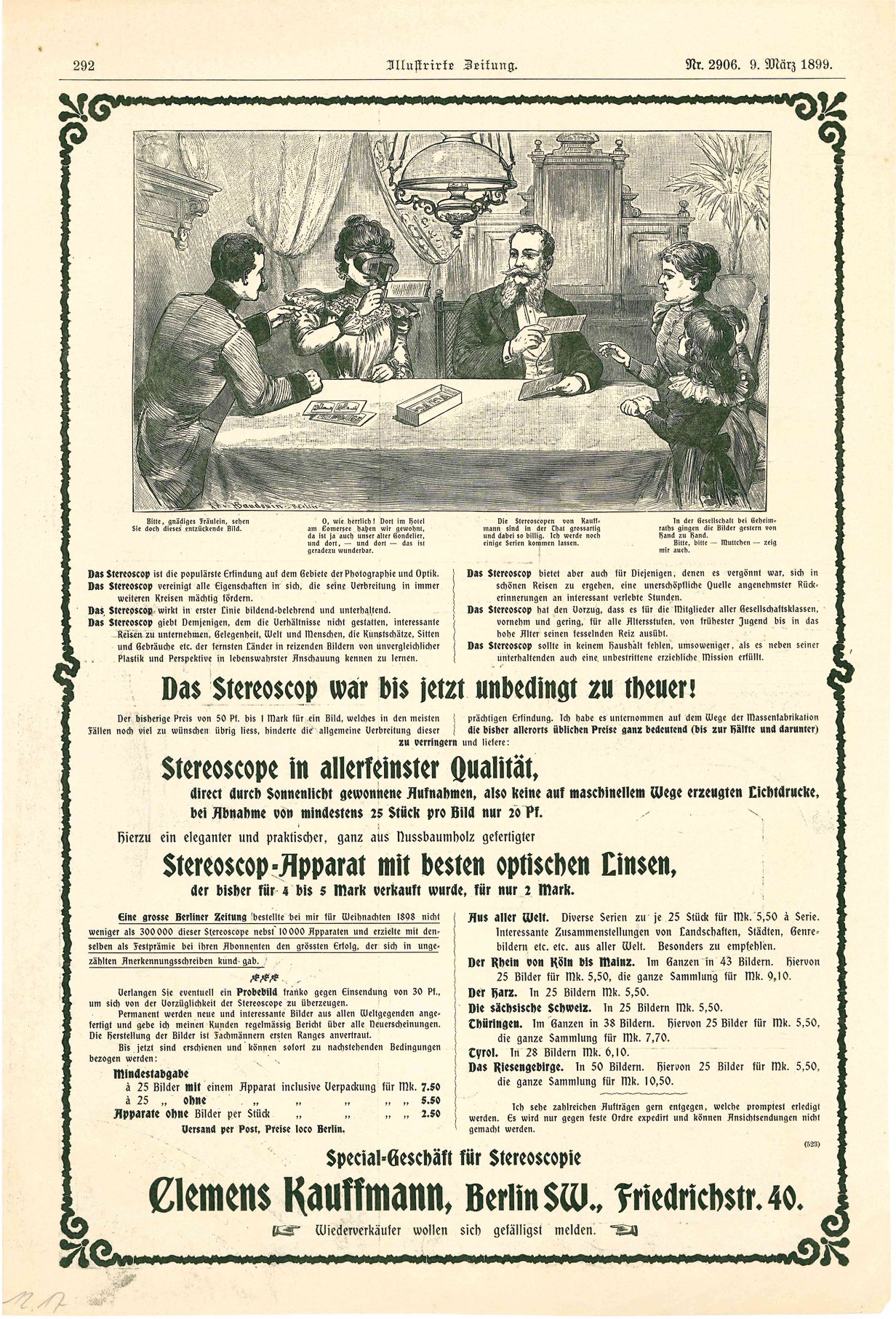 Advert for the stereoscopes sold by Clemens Kauffmann, Berlin