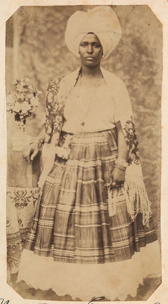Tradeswomen are depicted with a teapot on a table, a comb, a basket laden with bottles or wares carefully balanced on their heads; maids hold embroidered cloth and a wet nurse is shown with an infant. A native lady-in-waiting (and a young child) attend to a gorgeously dressed aristocrat, who wears a long veil. The hand-colored prints reinforce the sense of individual style associated with these remarkable figures; two of the indigenous women (one of whom wears a cross), simply pose in the studio sans tradewomen's objects.