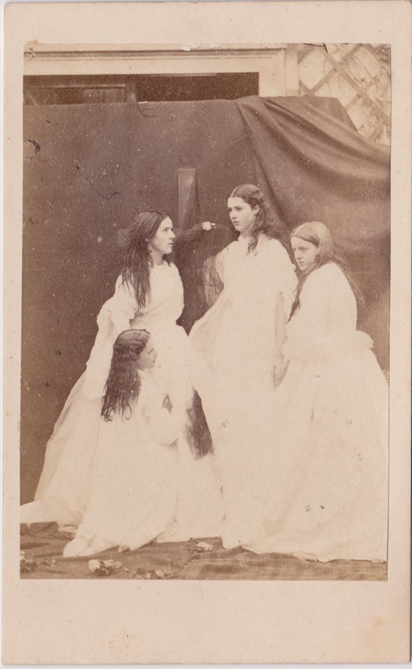 Although the back of the mount bears a backplate identifying the photographer as S. Ayling of 493, Oxford Street [London], this photograph is actually one of a series taken by Victor Albert Prout. The occasion was the Braemare Gathering held in the grounds of Mar Lodge in August 1863 during the first official visit to Scotland by the Princess and Princess of Wales. At the celebrations which followed the games, the Prince and Princess were entertained by a series of tableaux vivants and scenes from amateur theatricals staged by other guests. Full details of the event and the Mar Lodge album subsequently produced are given in "Staged Photography in the Victorian Album", an essay by Marta Weiss in Acting The Part: Photography as Theatre (2006).
