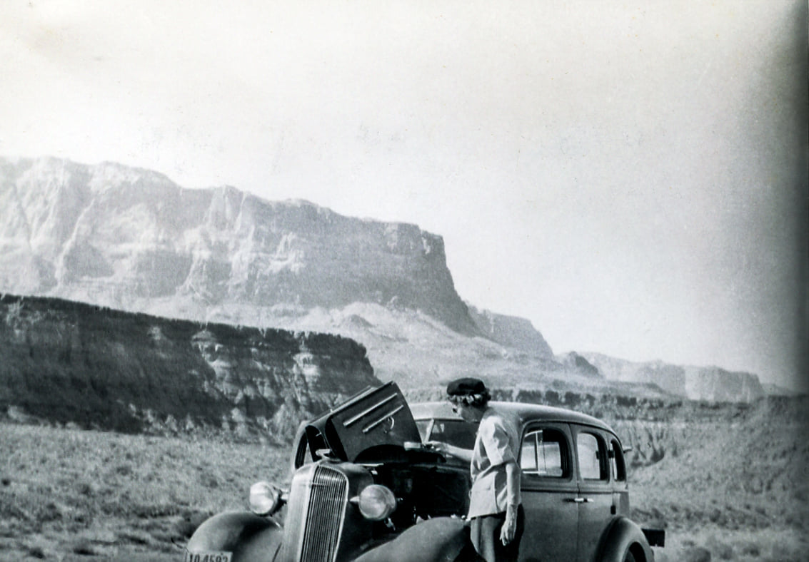 A desert landscape with car