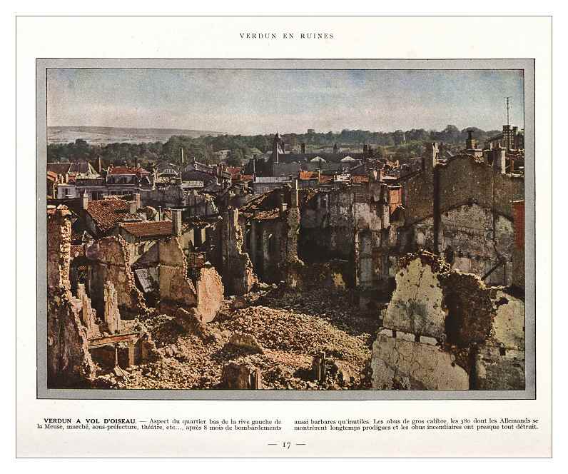 Jules Gervais-Courtellemont 1916-1917 Birds eye view of the damage to the city of Verdun. This illustration was part of a set published by L'Edition Franþaise Illustrée, 30 Rue de Provence, Paris. [1916à1917..., Les Champs de Bataille de Verdun!...]