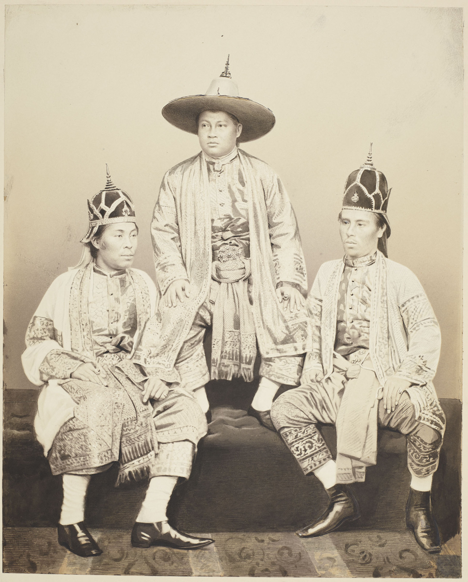 Photograph of a full length group portrait of three Siamese ambassadors seated in a triangular arrangement. The ambassadors are, from left to right, the 2nd Ambassador, Chow Moon San Pet Pakdi, adopted son of 1st (2nd?) King, 1st Ambassador, Phya Montri Suriwongse and 3rd Ambassador Cha Moon Montieu Petak Para Krom, foster brother of 2nd King.