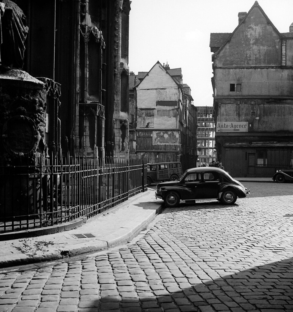 Voiture stationnée devant l'église Saint-Maclou, place Barthélemy (Rouen)
