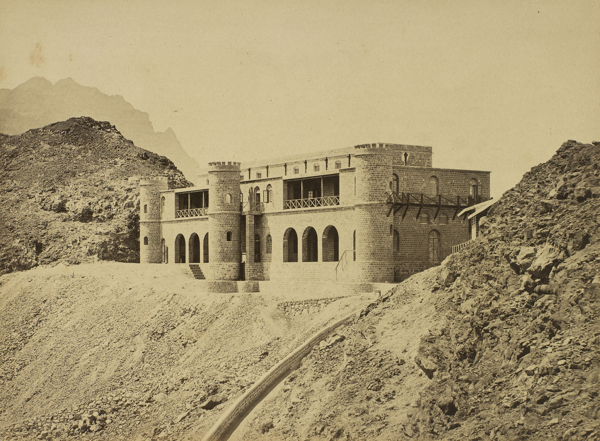 Photograph of two-storey building with flat roof and with three cylindrical towers with crenellation along facade. Lower storey has six arched doorways. Top storey has railings around veranda. The hillside drops away in front of building, and rocky hills rise to right and left.