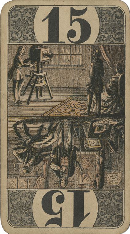 The back of a playing card showing a photographer in one picture and an artist in another