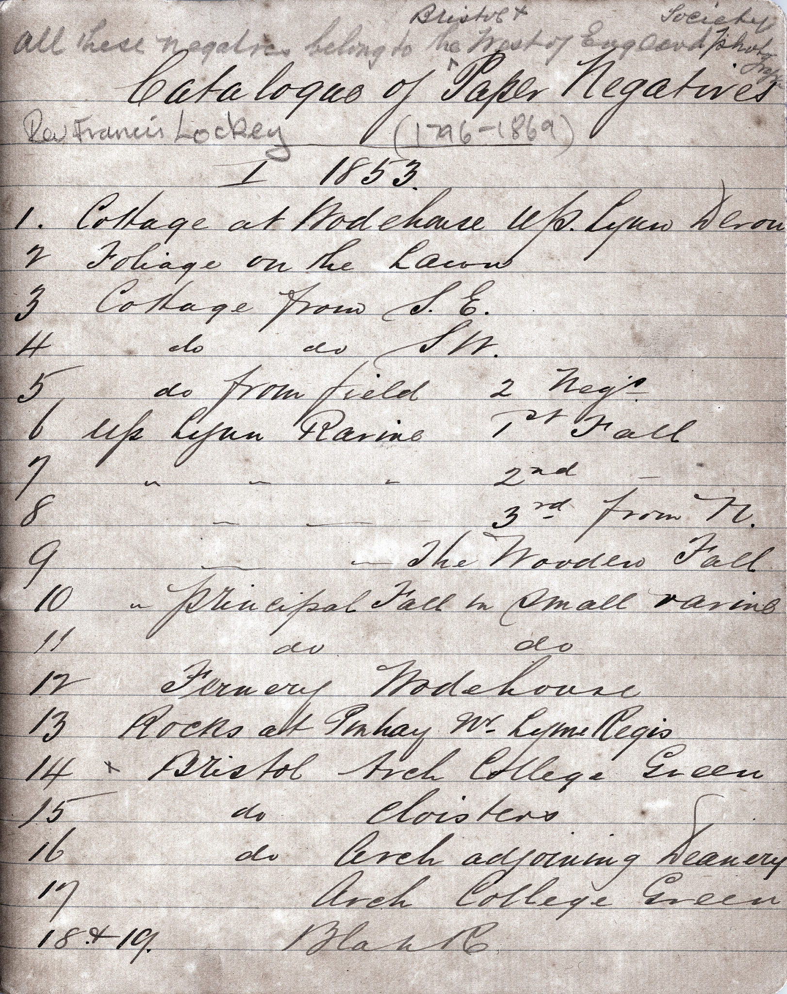 Archive Farms A manuscript exercise book compiled by Lockey, circa 1860, containing a list of his 369 large paper calotype negatives made between 1853 and 1860, 18 pp., remaining leaves blank, contemporary limp card covers. Lockey was rector of Swainswick near Bath and photographed architecture and landscapes, mostly in Somerset and South Wales in the 1850s. The catalogue lists all of his paper negatives and details places and also where they were made as stereo pairs. Lockey made negatives 8 x 11 inches and often made prints for use in a Wheatstone stereoviewer. Many of Lockey's negatives survive in the collections of St. Fagan's, Cardiff and the Bath Literary and Scientific Institute.