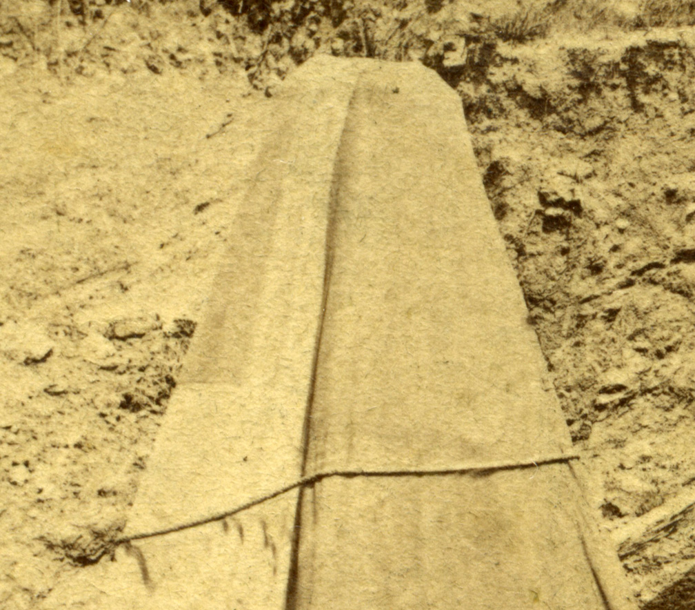 Stereoview, half, detail Private collection of Leonard A. Walle We think there may have been a safelight in the top. On the few images of his darkroom that exist, one has to wonder where his light source was. It may be in the back on the tents side. This cap porthole could have been just the yellow liner covering an opening on top. If I was the photographer, I would use a heavy piece of yellow glass that was removable as a sky light/light filter.